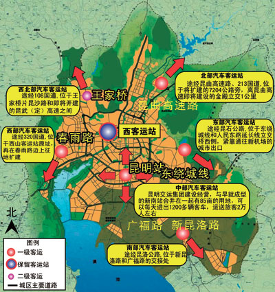 在这样的关键时刻,全体市民的理解、支持和参与至关重要。每个市民是否能做到顾全大局,克服困难,能否做到文明礼让,配合施工单位、管理部门工作,能否改变出行习惯,多骑车、乘公交,都将影响到一年交通计划能否按时、顺利完成。“长痛不如短痛”,我们呼吁每个市民以实际行动为昆明交通一年计划贡献自己的力量,共同营造更加美好的家园。 明年底昆明完成6个客运站建设 位于二环路内外的15个客运站,现在每天3200多辆大客车进出主城区,对昆明二环南路附近的交通带来巨大压力。火车站附近的昆明、金湾、中北、风景旅游、新南站等6个汽车客运站,2000多辆进出站的大客车是造成永平路、春城路、南二环拥堵的重要因素。昆明早在去年就已重新选址规划了6个新客运站,市交通局黄金周之后首日专门召开党委会确定:计划在今年内拿齐6个新站的规划选址意见书,并做好土地收储,通过招投标,明年春节后开工建设6个客运站,确保明年年底客车可以进场经营,从而减少3200辆大客车对主城交通的添堵。