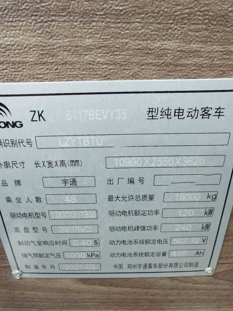 | 客车品牌 | 宇通客车 | 上牌时间 | 2021-04-09 |