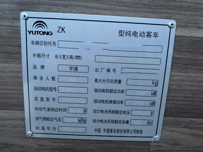 | 客车品牌 | 宇通客车 | 上牌时间 | 2021-12-16 |