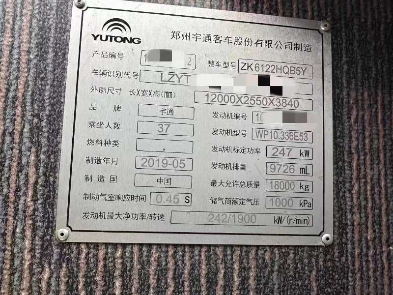 | 客车品牌 | 宇通客车 | 上牌时间 | 2019-07-19 |