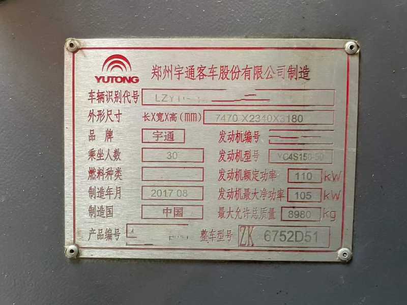 | 客车品牌 | 宇通客车 | 上牌时间 | 2017-06-14 |