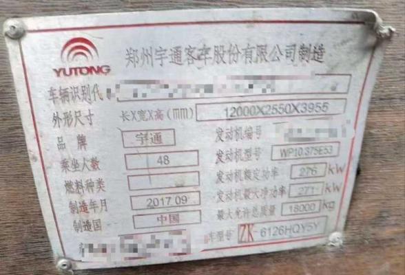 | 客车品牌 | 宇通客车 | 上牌时间 | 2017-09-21 |