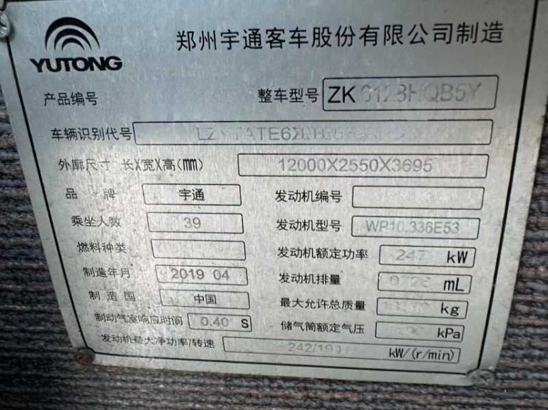 | 客车品牌 | 宇通客车 | 上牌时间 | 2019-04-24 |