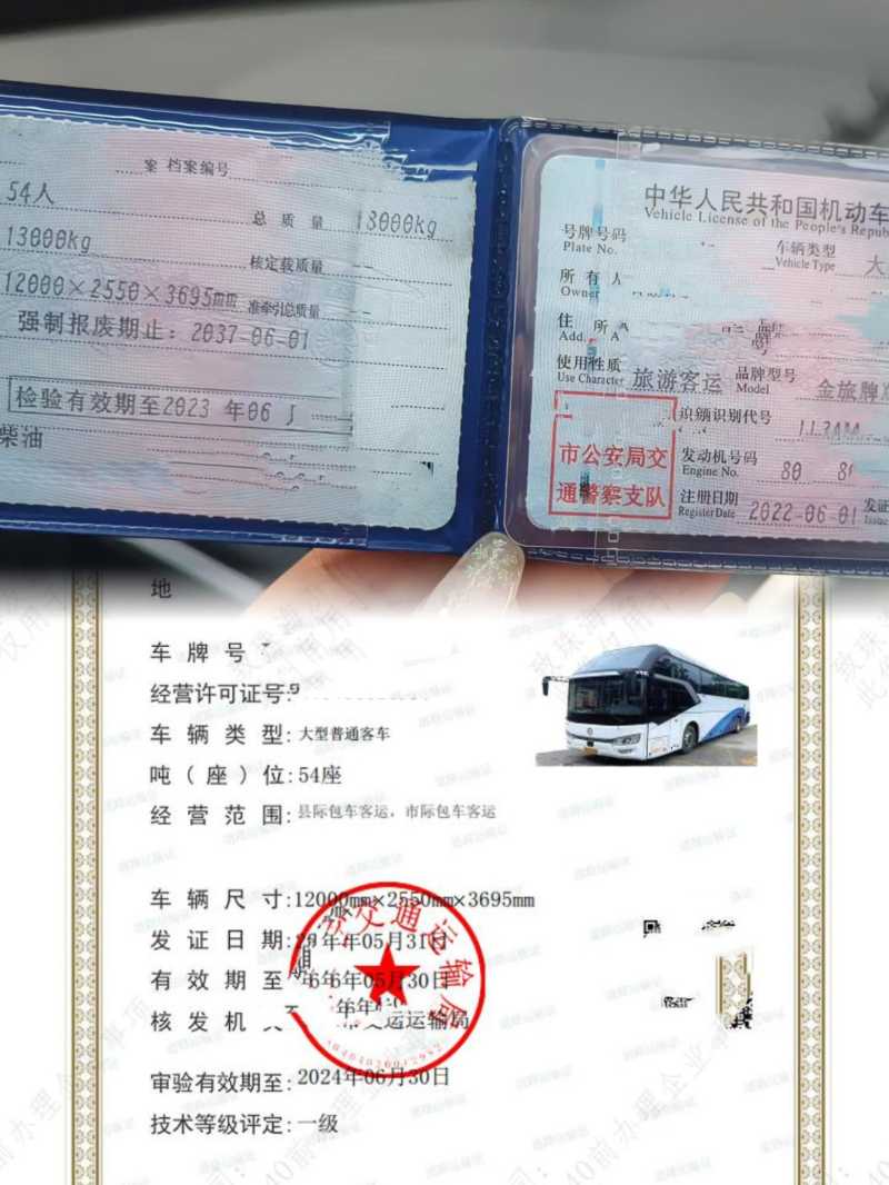 国六54座旅游车,2022年上牌金旅12米,玉柴330国六机头,气囊中门,通仓,行李架,司机独立驾驶,旅游客运可提营运.
