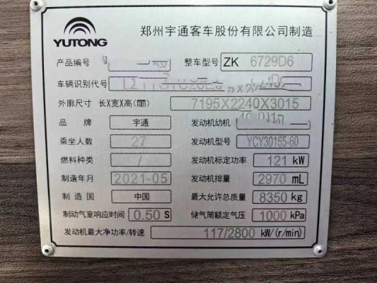 27座国六宇通6729,21年7月上牌,非营运有营运公告,下沉加大行李舱。玉柴165发动机。整车原版原漆。 手动6速.