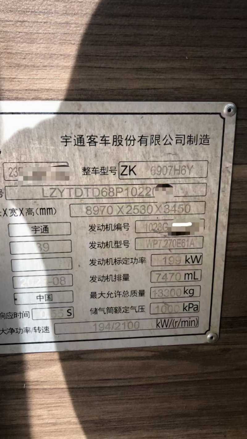 刚上牌7个月国六准新39座[色]2023年8月上牌宇通6907 ,省际旅游客运 , 潍柴270 机头, 气囊车,缓速器 暖气,安全门,有营运公告和营运档案.