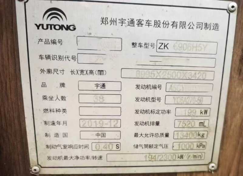 来台国五38座抢手货[色]2020年上牌宇通6906气囊车,缓速器,玉柴270机头,有安全门,暖气,公路客运可提营运。