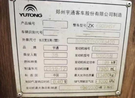| 客车品牌 | 宇通客车 | 上牌时间 | 2020-01-16 |