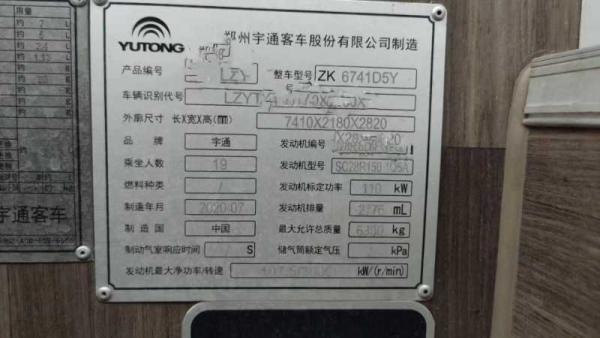 | 客车品牌 | 宇通客车 | 上牌时间 | 2020-08-18 |