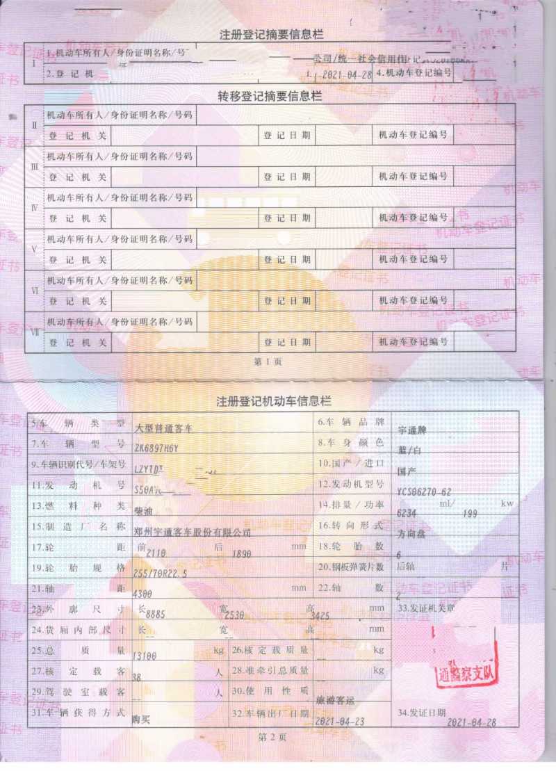 | 客车品牌 | 宇通客车 | 上牌时间 | 2021-04-13 |