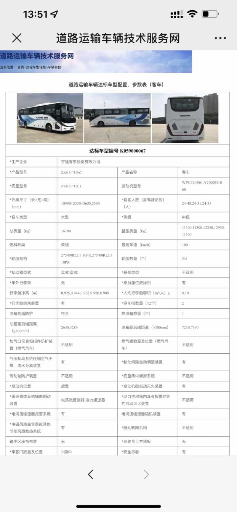 2022年4月 国六48座锅炉暖气大型中级公告宇通6117客车
