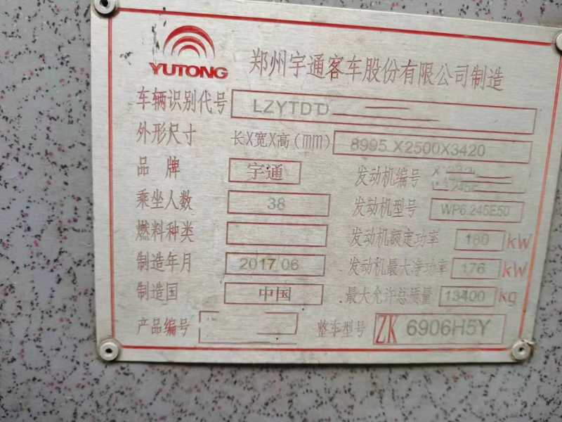 2017年6月 国五38座宇通6906营运车