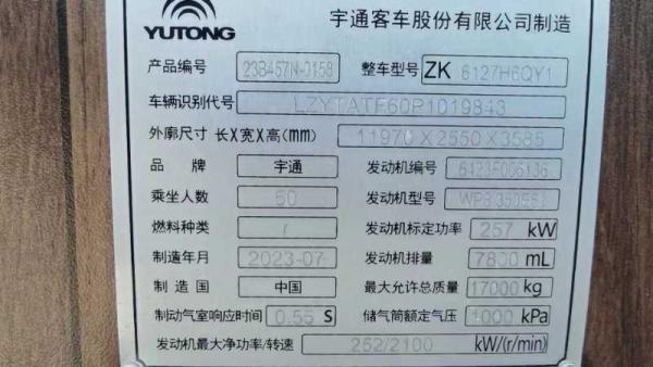 | 客车品牌 | 宇通客车 | 上牌时间 | 2023-08-30 |