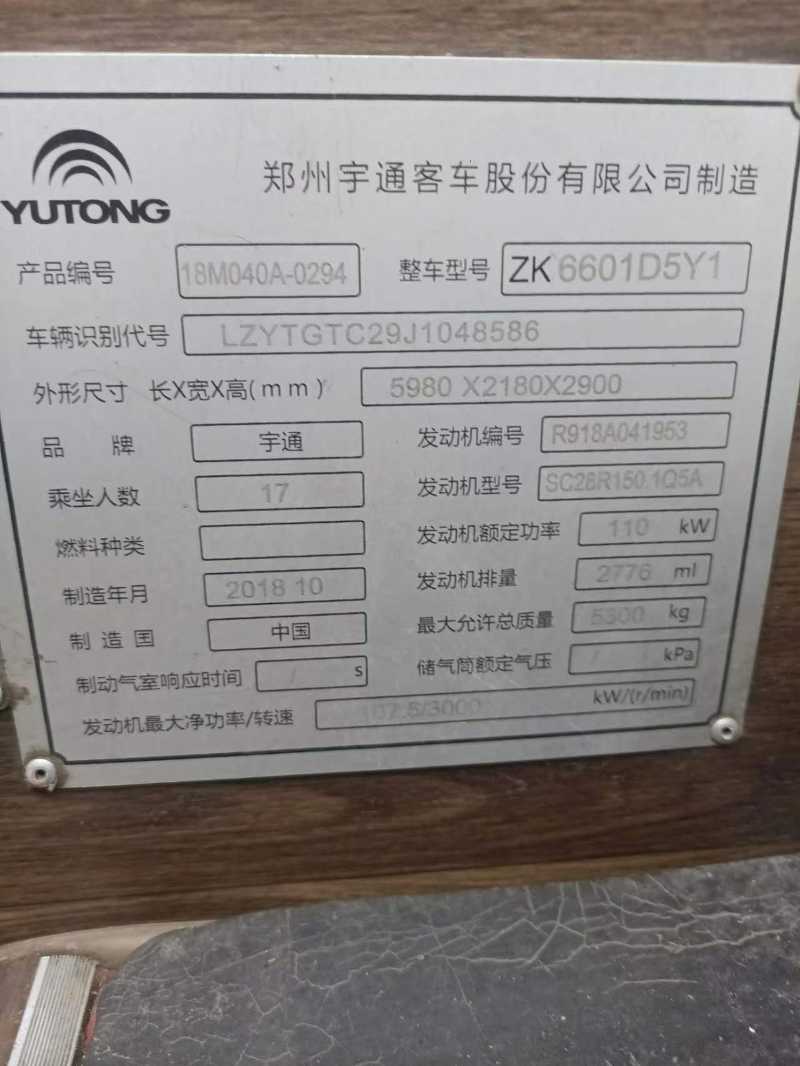 | 客车品牌 | 宇通客车 | 上牌时间 | 2018-11-29 |