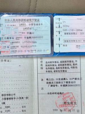 特价出2台9座蓝牌宇通营运车绝版,2020 年 10 月上户宇通6601D5Y 蓝牌、高速 1 类通行费,上柴 2.8T柴油国五机头,