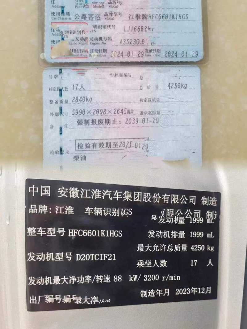 | 客车品牌 | 江淮客车 | 上牌时间 | 2024-01-18 |