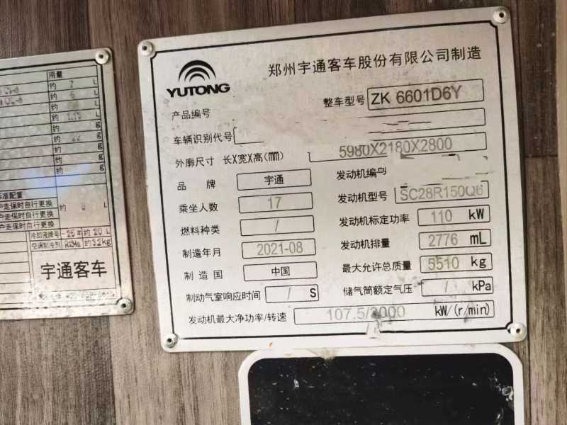 | 客车品牌 | 宇通客车 | 上牌时间 | 2021-10-06 |