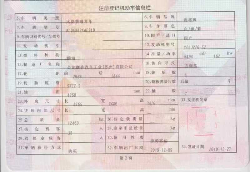 | 客车品牌 | 海格客车 | 上牌时间 | 2019-12-18 |