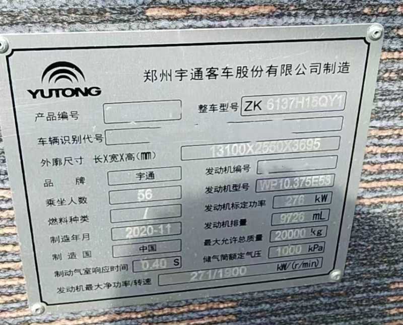| 客车品牌 | 宇通客车 | 上牌时间 | 2021-06-16 |