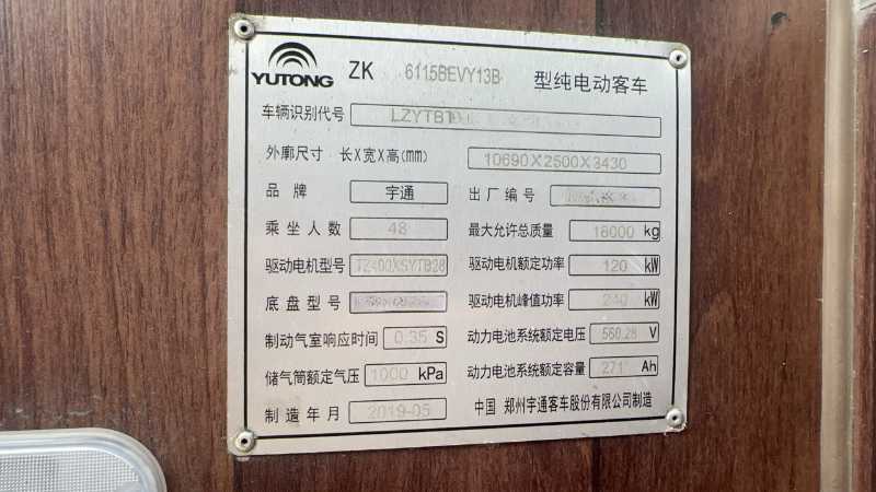 2019年6月 48座非营运宁德时代宇通6115新能源纯电客车