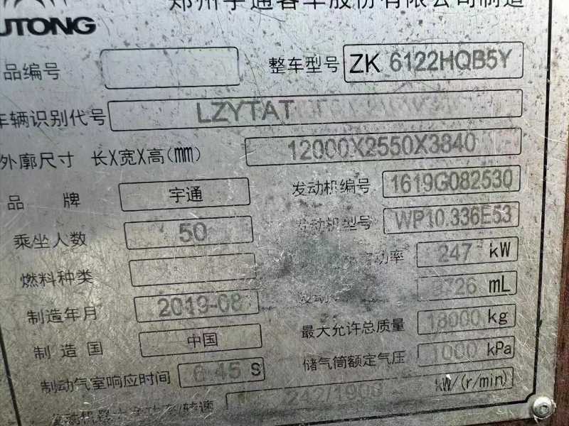 | 客车品牌 | 宇通客车 | 上牌时间 | 2019-09-17 |