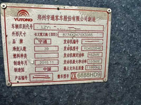 | 客车品牌 | 宇通客车 | 上牌时间 | 2015-12-24 |