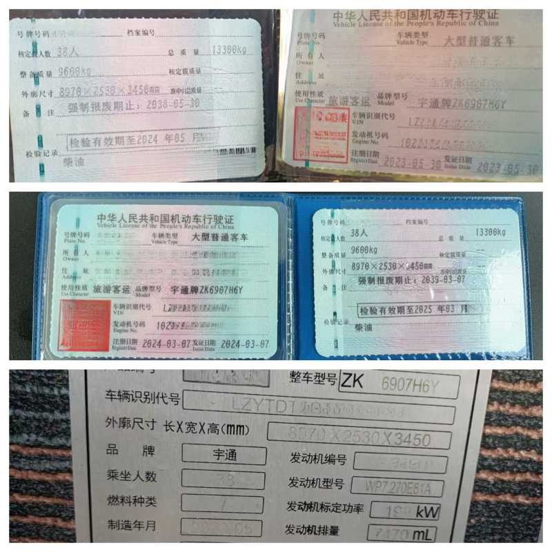 同款两台国六38座宇通6907旅游车,2023年5月,气囊车,潍柴270发动机,有公告,USB接口,科林空调,非独立+三壁挂+一盒式+水暖除霜,同款2024年3月有一台,随时提档: