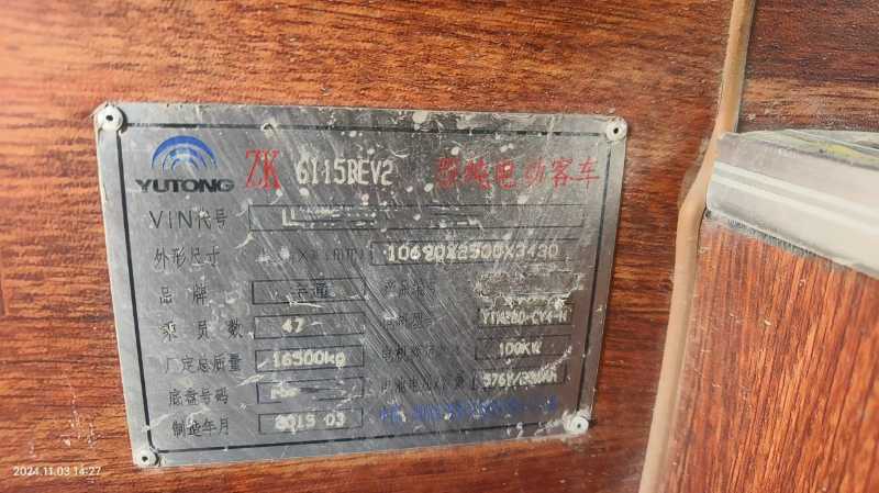 一批2015年上牌47座纯电动宇通6115营运电车,宁德时代电池(有力神电池),162度,有电池加热,钢板减震,公路客运性质,有中门,有营运档案,可提公路客运,外观内饰成色好。随时提档: