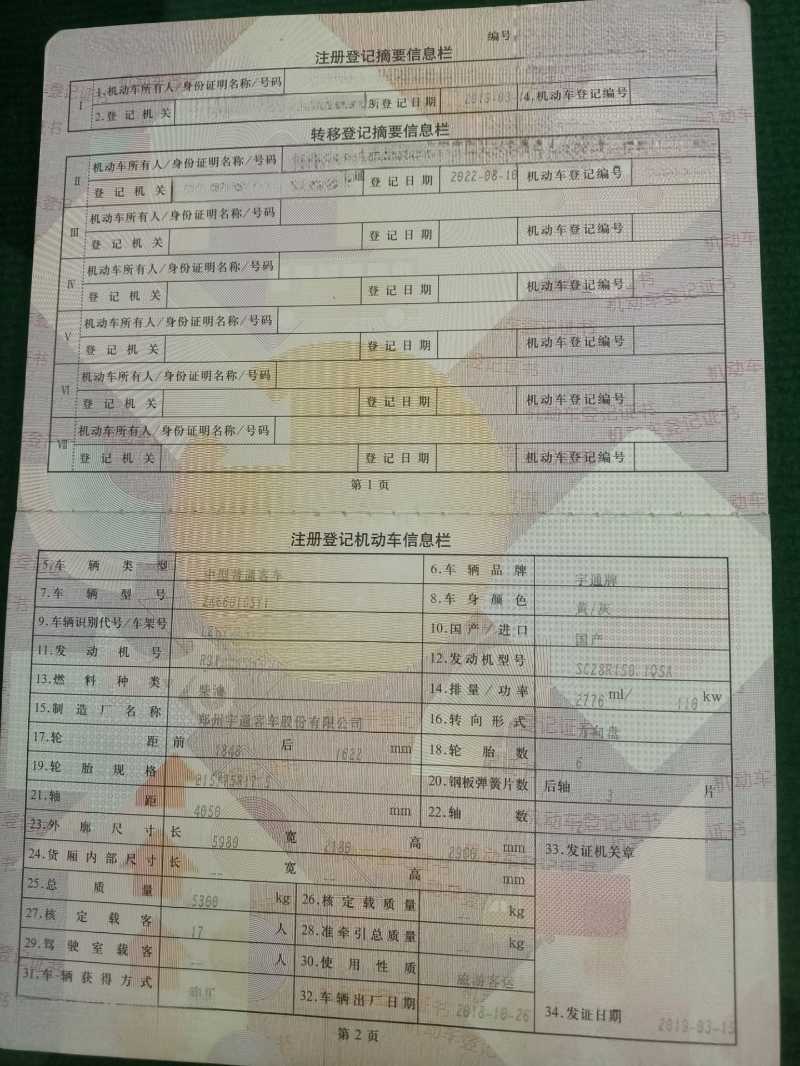 | 客车品牌 | 宇通客车 | 上牌时间 | 2019-03-13 |