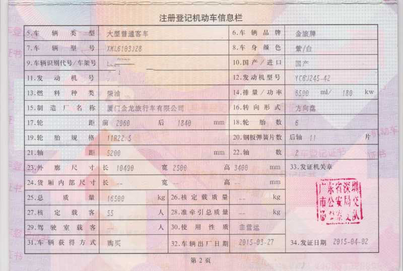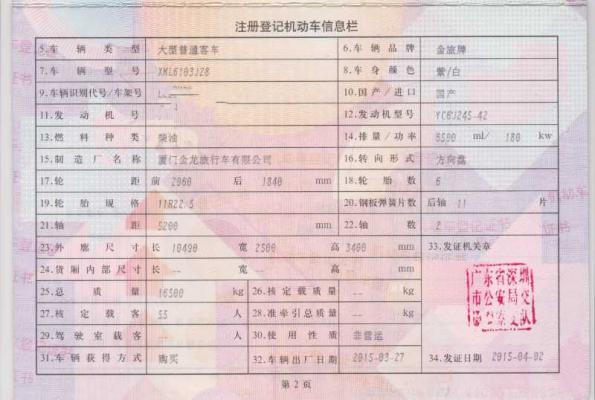 | 客车品牌 | 金旅客车 | 上牌时间 | 2015-04-23 |