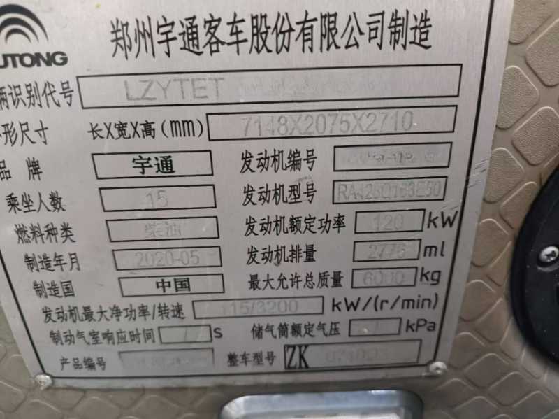 | 客车品牌 | 宇通客车 | 上牌时间 | 2020-06-25 |