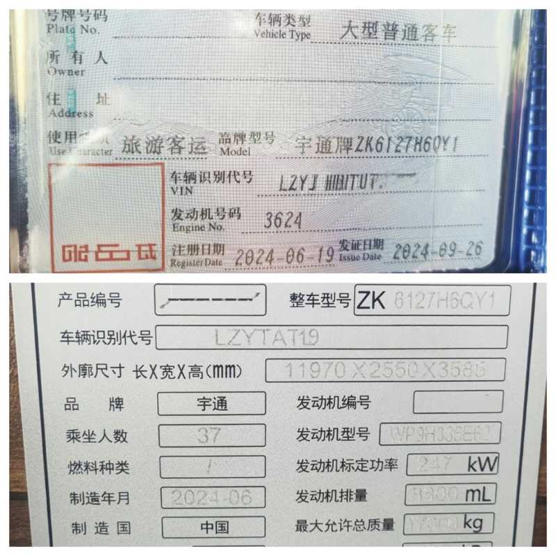 2024年6月 准新国六双档37座2+1宇通6127旅游车