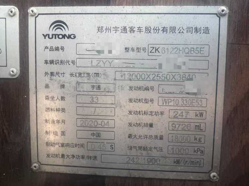 | 客车品牌 | 宇通客车 | 上牌时间 | 2020-04-21 |