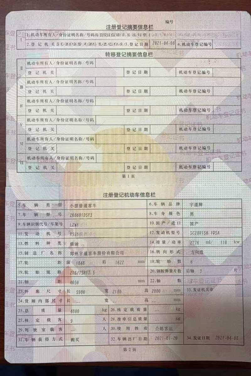 | 客车品牌 | 宇通客车 | 上牌时间 | 2021-04-21 |