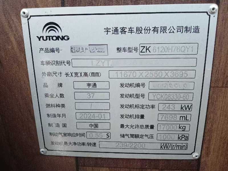 | 客车品牌 | 宇通客车 | 上牌时间 | 2024-01-16 |