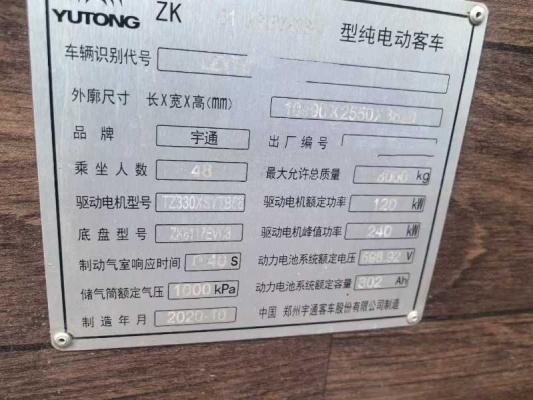 | 客车品牌 | 宇通客车 | 上牌时间 | 2020-12-24 |