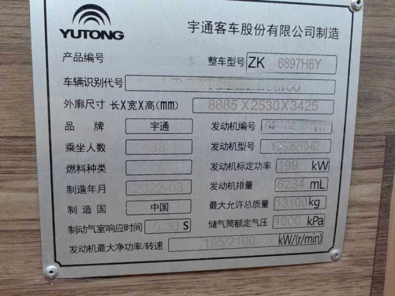 2022年6月上牌东北配国六有公告38座宇通6897气囊车