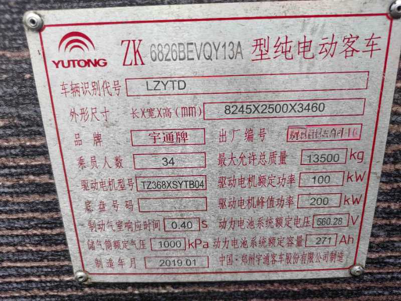 | 客车品牌 | 宇通客车 | 上牌时间 | 2019-01-16 |