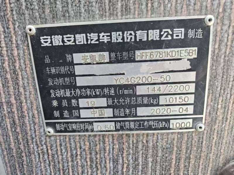 | 客车品牌 | 安凯客车 | 上牌时间 | 2020-05-19 |
