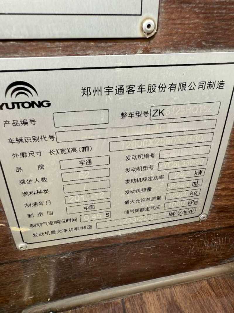 | 客车品牌 | 宇通客车 | 上牌时间 | 2019-12-11 |