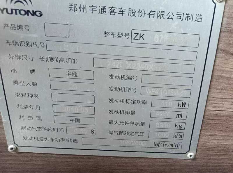 | 客车品牌 | 宇通客车 | 上牌时间 | 2019-05-21 |