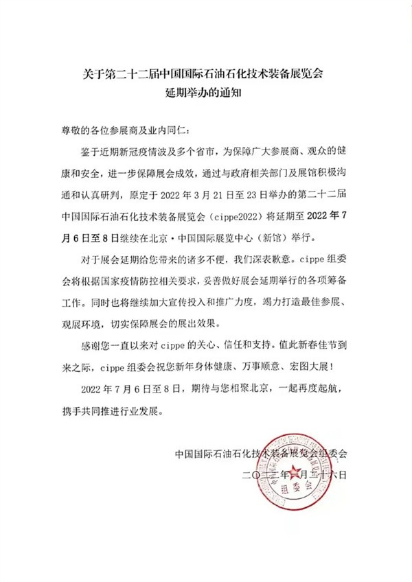 鉴于近期新冠疫情波及多个省市,为保障广大参展商、观众的健康和安全,进一步保障展会成效,通过与政府相关部门及展馆积极沟通和认真研判,原定于2022年3月21日至23日举办的第二十二届中国国际石油石化技术装备展览会(cippe2022)将延期至2022年7月6日至8日继续在北京·中国国际展览中心(新馆)举行。2022北京国际氢能技术装备展览会(HEIE2022)也将与之同期举办,欢迎您届时参展参观。