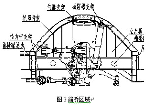 在地板通道上方搭装有槽形纵梁、立封板、弧形轮罩骨架、加强支撑等,并安装悬架总成中各零部件支架(气囊支架、推力杆支架、减震器支架等),见图3所示。