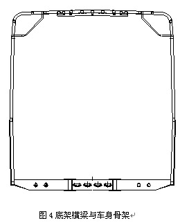 纵梁采用的是160X60X6.0的矩形钢管,纵梁与横梁连接方式是采用纵梁分段而横梁贯通的方式。贯通的横梁与车身骨架中的左右侧围立柱及大顶骨架横梁构成封闭的环状结构,以提高整车抗扭强度。见图4所示。