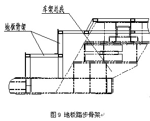 底架中段和后段之间的过渡区域是底架结构处理中的关键区域,通常采用搭接式大梁结构(见图8)通过两级踏步使后桥地板通道抬高以避开后桥,同时为使车架截面过渡平缓,不产生突变而造成应力集中,在搭接梁前、后纵梁形状方面作一些处理,并且在设计车身地板骨架时将二级踏步的骨架作如图9所示加强,在实现地板通道从中段平地板向后段地板过渡的同时使得截面过渡平缓,减小应力集中的可能,从而最大程度的保证整车骨架的整体强度。