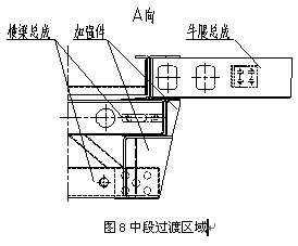 注:此处是车架纵梁截面变化比较大的地方,设计时应考虑采用适当的加强(如增加斜撑、连接板等)使得截面过渡平缓不至于产生较大的应力集中。