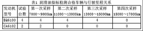从表1的数据可得出:公交公司天燃气营运车,使用的40SD/CC 级通用润滑油,合理的换油周期(取下限值):东风EQ6100 型发动机换油里程小于15000km;解放CA6102 型发动机换油里程小于9000km;从以上结论可看出,两种车型使用同一种机油,换油周期是不同的,若在同一机械保养周期(最新的保养制度:一级保养为7000km,二级保养为27000km)换油,都将造成润滑油的浪费或发动机的异常磨损,显然是不合理的。