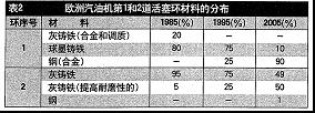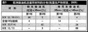 原则上,商用车柴油机第1道压缩环使用球墨铸铁已有非常丰富的经验,这从球墨铸铁环在欧洲柴油机上占有很高的分额就反映出来了(表3)。但是,自从上世纪60年代以来,具有非常低轴向磨损的含铬18%铬钢镀层压缩环在商用车柴油机上的应用也具有相当丰富的批量生产使用经验。此外,随着气缸爆发压力明显超过20MPa,可望钢活塞环的应用会有所增长。
