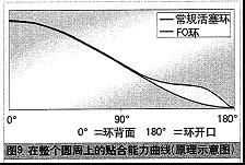 单体环的贴合能力在整个圆周上是不均匀的,特别是在环开口对面达到最大值。由于在开口端部没有弯曲力矩,因此该处的贴合能力降至零。图9表示出常规活塞环和一种FO(形状优化)环在整个圆周上贴合能力的比较。图10所示的FO环通过靠近开口处径向宽度的可变设计得到了形状优化的活塞环,从而改善了活塞环的局部弯曲能力和对气缸不均匀变形的适应能力。