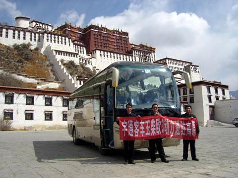 绿色欧Ⅲ动力玉柴机器宇通客车在拉萨布达拉宫门前 |